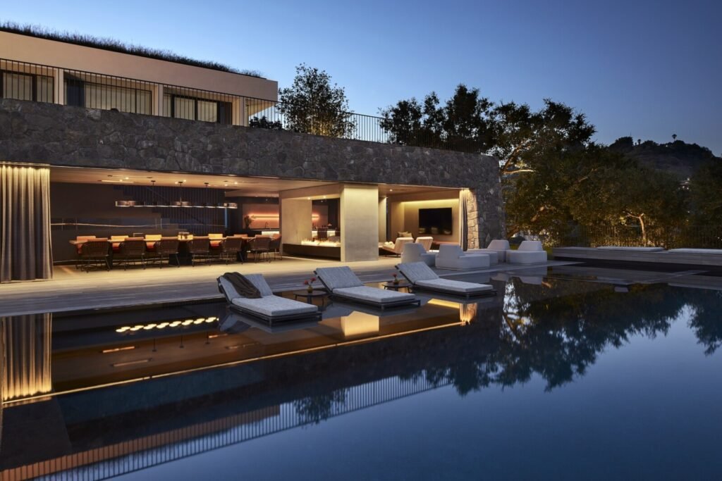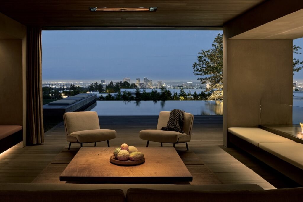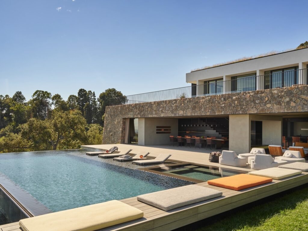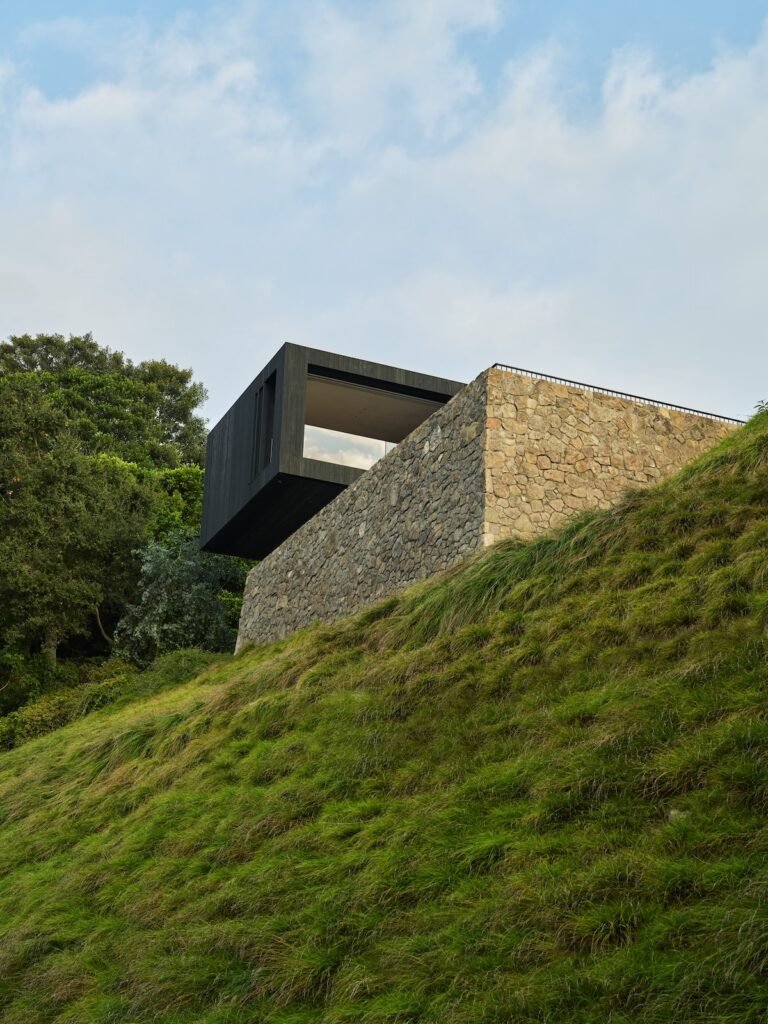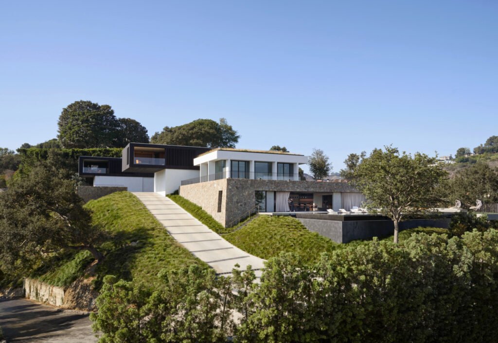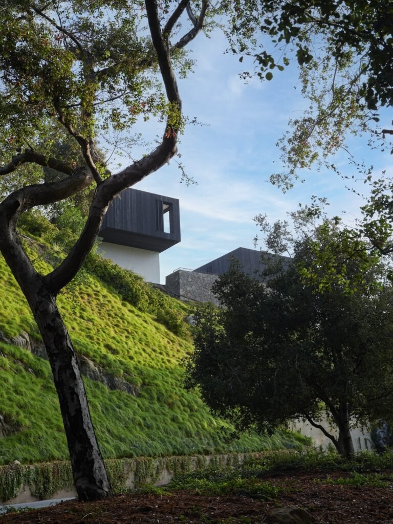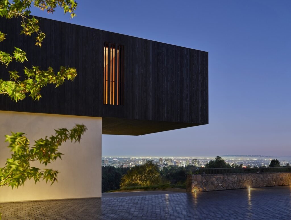 Set on a promontory in the heart of the Santa Monica Mountains, Strata House preserves the site’s rich history through contemporary form and finishes. The project name signifies the many iterations and layers – or “strata” – of the property’s past, which is also expressed through its materiality. A battered stone base references the site’s longtime evolution and provides a foundation for the home’s glass-walled pavilion, a vestige from a past life when the site was home to a 1960s structure designed by Modernist architect John B. Parkin. Two delicate cantilevers clad in Shou Sugi Ban rest atop the volumes below, representative of its current reimagining as a private residence.