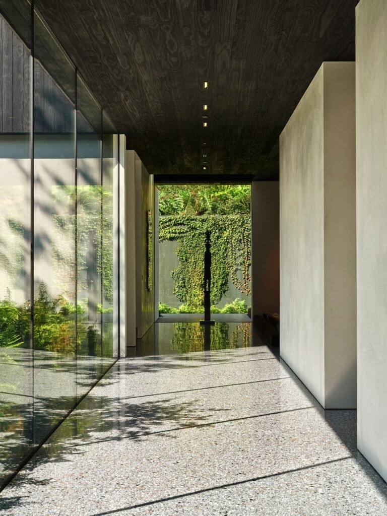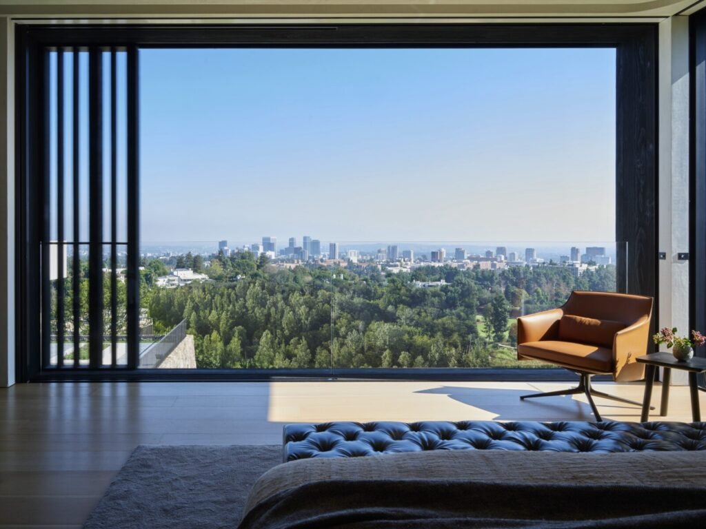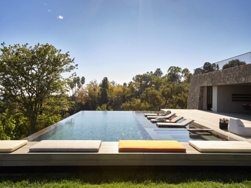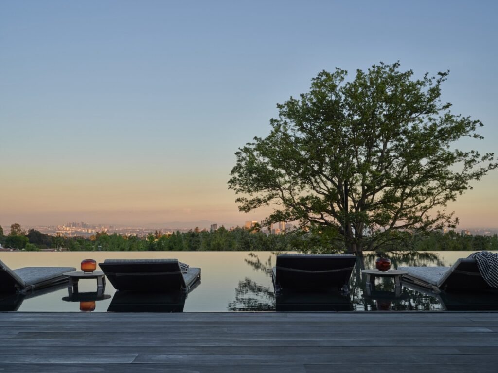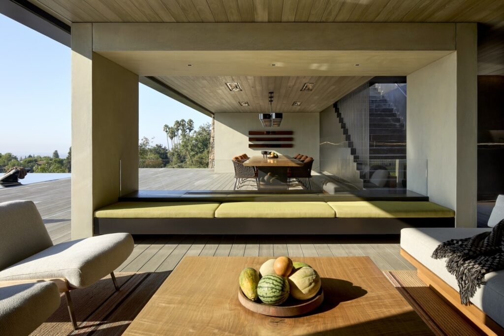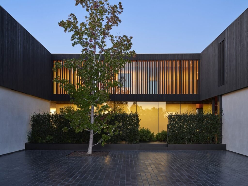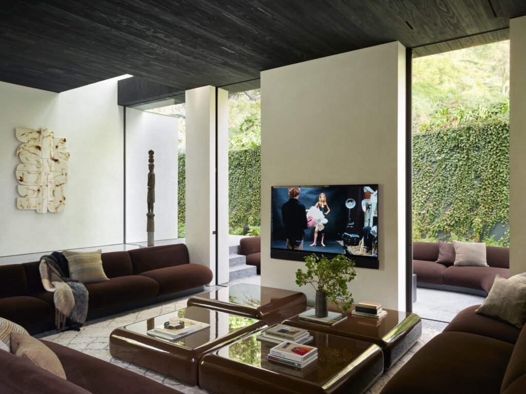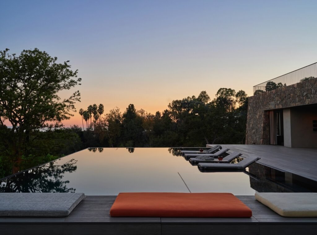 Set on a promontory in the heart of the Santa Monica Mountains, Strata House preserves the site’s rich history through contemporary form and finishes. The project name signifies the many iterations and layers – or “strata” – of the property’s past, which is also expressed through its materiality. A battered stone base references the site’s longtime evolution and provides a foundation for the home’s glass-walled pavilion, a vestige from a past life when the site was home to a 1960s structure designed by Modernist architect John B. Parkin. Two delicate cantilevers clad in Shou Sugi Ban rest atop the volumes below, representative of its current reimagining as a private residence.